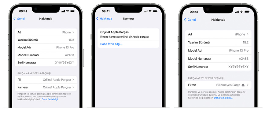 Bu kısım oldukça önemli. Yine aynı şekilde iPhone telefonlarda AYARLAR – GENEL – HAKKINDA kısmında “PARÇALAR ve SERVİS GEÇMİŞİ” başlığı altında değişen parçalarını görebilirsiniz. Örneğin bir ekran değiştiyse kesinlikle bu kısımda değişen parça bilgisi yer alacaktır. Batarya, Kamera, Anakart, Ekran gibi ana donanım birimlerinden değişenler burada yer alır.
