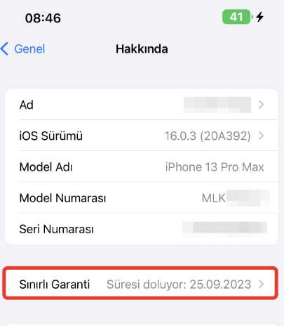 iPhone telefonlarda AYARLAR – GENEL – HAKKINDA kısmında bir SINIRLI GARANTİ SÜRESİ yer alabilir. Buradaki süre telefonunuzun ne zaman kullanılmaya başladığı hakkında fikir verebilir. Örnek olarak şu anki tarihe göre sınırlı garanti 25.09.2023 şeklinde yazıyorsa bu telefonun yaklaşık 1 aydır kullanıldığı anlamına gelecektir. Bu nedenle sıfır – kutusunda bir iPhone aldıysanız buradaki sınırlı garantinin 12 ay süre olması gerekiyor. Bu telefonun uluslararası garanti süresi olduğu belirtelim. Bu tarihe bakarak telefonunuz ilk olarak kutusundan ne zaman çıkarılıp açılmış olduğunu öğrenmiş oluyorsunuz.