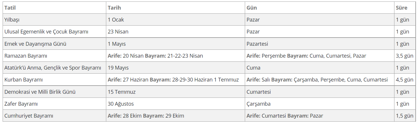 Not: Arife olarak belirtilen günler yarım gün resmî tatildir.