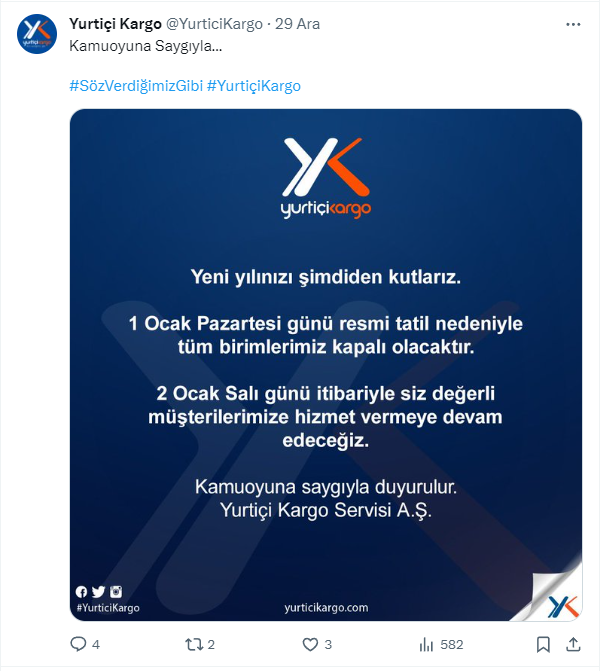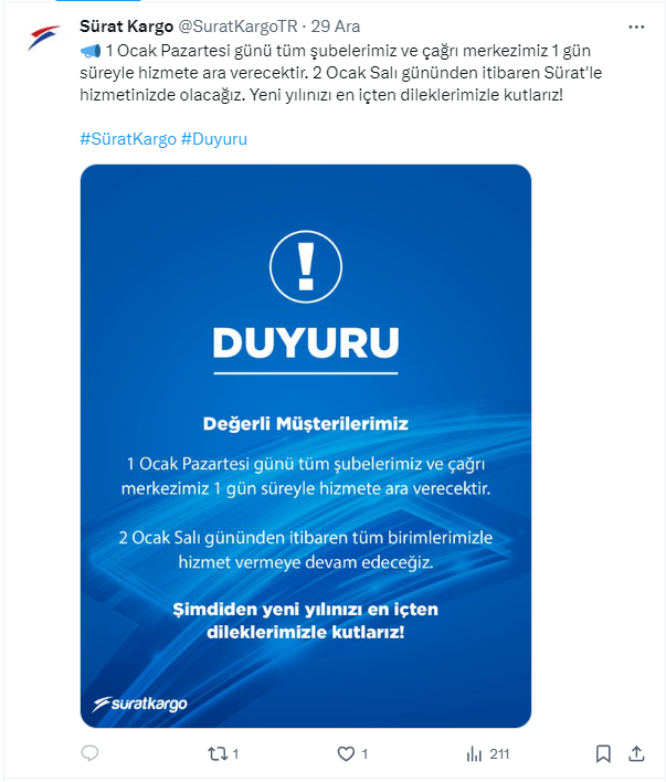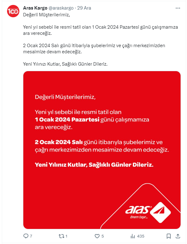 Aras, Yurtiçi ve Sürat Kargo Şirketleri resmi sosyal medya hesaplarından yaptıkları duyuruda “1 Ocak 2024 Pazartesi günü resmi tatil olması sebebiyle kapalı olacaklarını” belirtmişlerdir. Bu nedenle diğer kargo şirketlerinin de yılbaşında kapalı olacağını söyleyebiliriz.