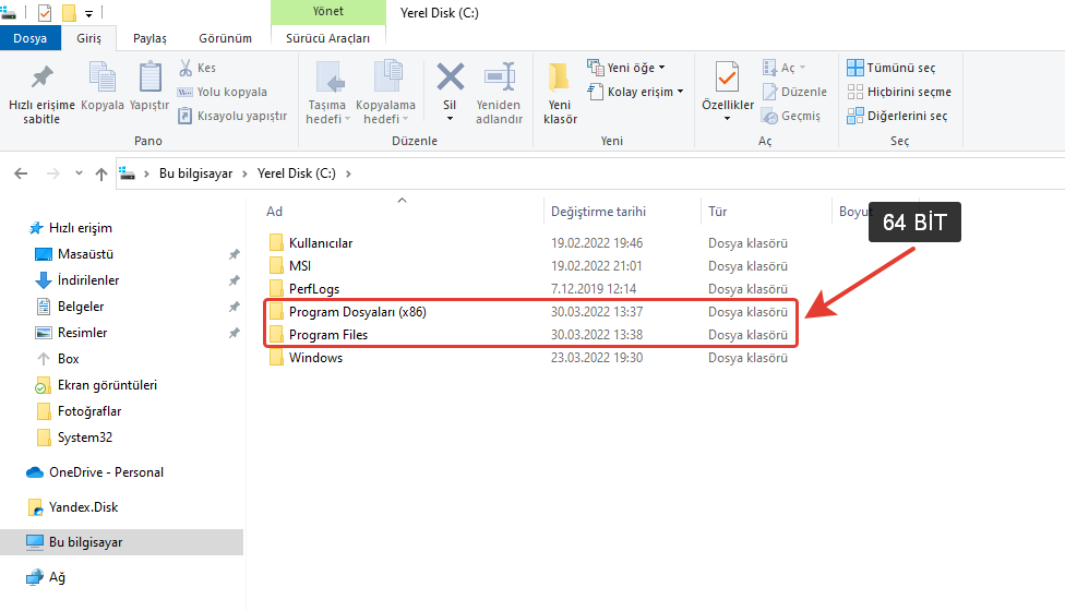 Ancak, Windows’un 64-bit sürümleri için, Program Files klasörü 64-bit uygulamaları içerirken, Program Dosyaları (x86) klasörü tüm 32-bit uygulamaları içerecektir.