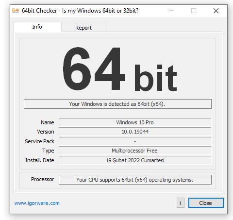 Igorware‘in 64bit Denetleyicisi (64bit Checker), sistem mimarinizi hızlı ve etkili bir şekilde kontrol eden ücretsiz bir Windows aracıdır. 64bit Checker, işletim sistemi, CPU’nuzun 64 bit uyumluluğu ve çalıştırmakta olduğunuz Windows sürümü hakkında bilgi verir.