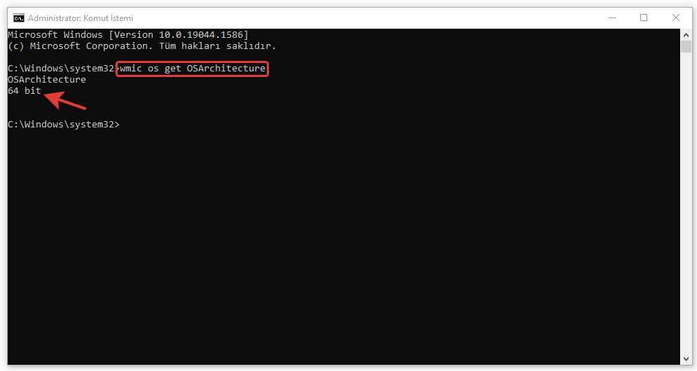 Komut İstemi paneli açıldığında wmic os get OSArchitecture komutunu yazın. Enter tuşuna bastıktan sonra, istem makinenizin işletim sistemi hakkında bir bilgi listesi döndürür.