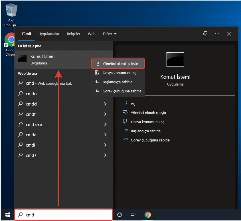 Windows Başlat Menünüzün arama çubuğuna cmd yazın. Açılan panelde en üst kısımda Komut İstemi sekmesi gelecektir. Normalde yaptığınız gibi tıklamak yerine Komut İstemi sekmesinin üzerini sağ tıklayın ve Yönetici Olarak Çalıştır‘ı seçin.