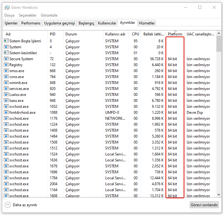 32-bit, 64-bit uygulama göstermeyecek, tek bir uygulama bile 64-bit ise Windows’un 64-bit sürümleri belirgin olacaktır.