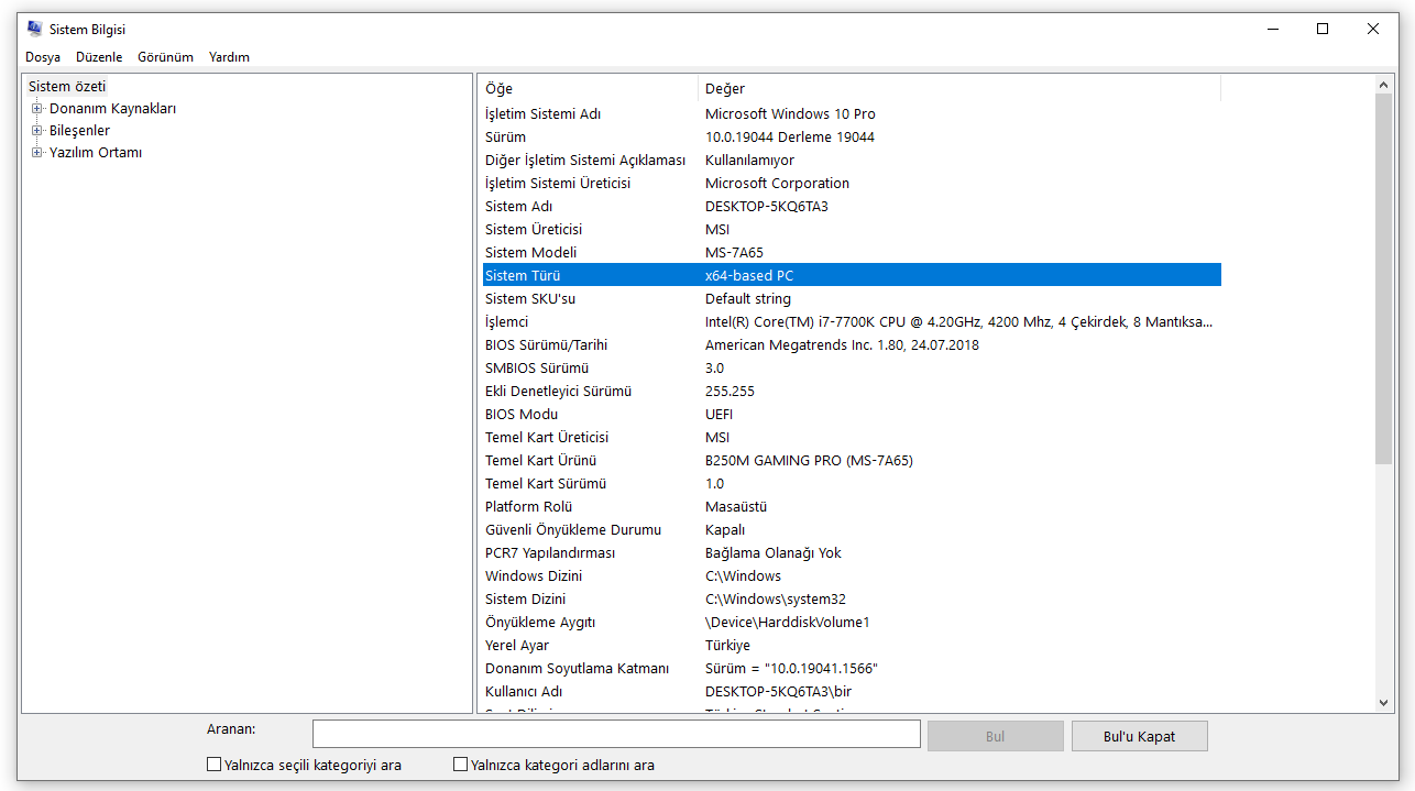 Sistem Bilgisinin sağ tarafındaki Öğe sütununun altındaki Sistem Türü seçeneğini arayın.