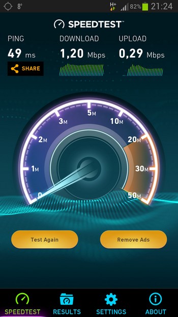 Telefonumla 84 Mbps’yi bırakın normal değerinde bir hız alamadım. Bakın Şişli’nin göbeğinde yaptığım test! İndirme hızı 1.20 Mbit/s ve yükleme hızı 0.29 Mbit/s. Sen kalkmış 4.5G’nin reklamını yapıyorsun. Diyorsun ki kullandığın telefon ve sim kartı desteklerse İndirme hızın 100-300 Mbps yükleme hızın ise 3-5 Mbps. Gel de gülme.