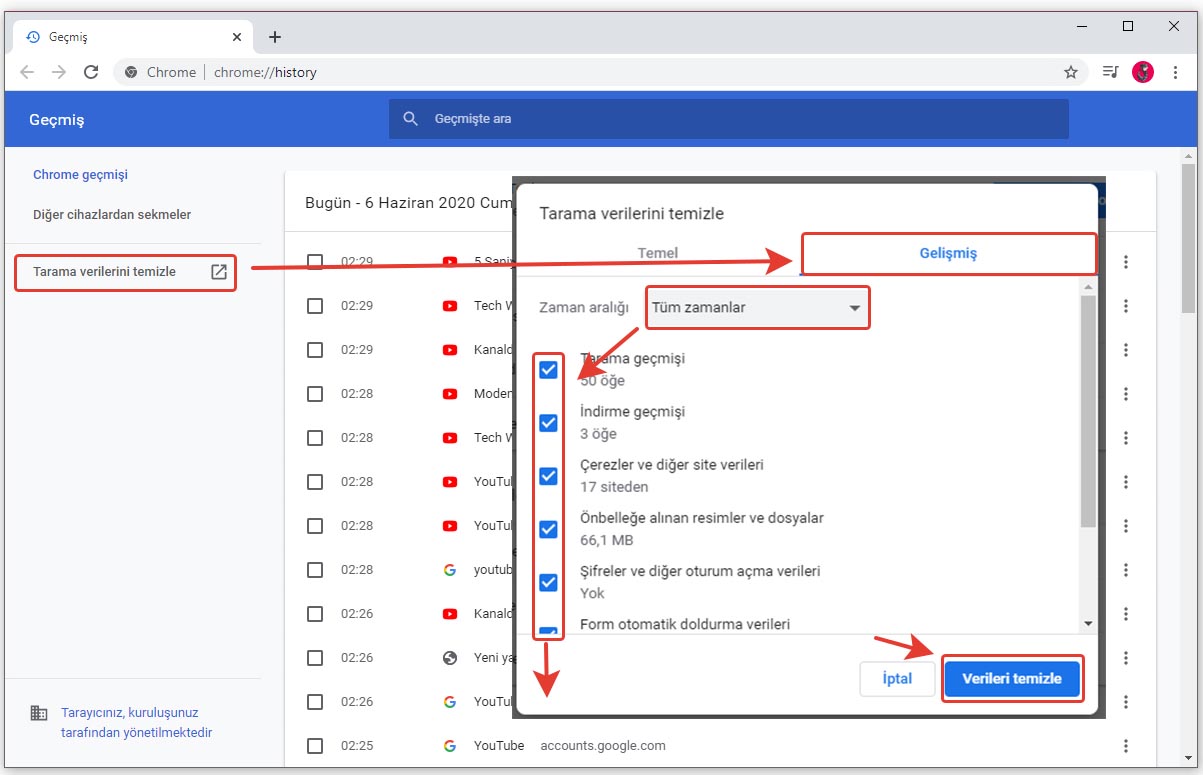 Google Chrome için CTRL+H tuşuna bastıktan sonra gelen internet geçmişi penceresinden “Tarama Verilerini Temizle” diyoruz. Ardından gelen panelden “Gelişmiş” kısmını seçerek, zaman aralığını “Tüm Zamanlar” yapıyoruz ve alttaki tüm kutucuları seçili hale getirip “Verileri temizle” diyoruz. Böylece Google Chrome tarayıcısındaki tüm internet geçmişi silinmiş olacaktır.
