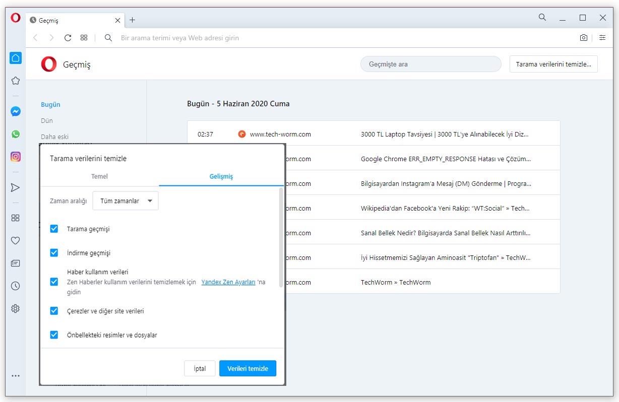 Opera için CTRL+H tuşuna bastıktan sonra gelen internet geçmişi penceresinden “Tarama Verilerini Temizle” diyoruz. Ardından gelen panelden “Gelişmiş” kısmını seçerek, zaman aralığını “Tüm Zamanlar” yapıyoruz ve alttaki tüm kutucuları seçili hale getirip “Verileri temizle” diyoruz. Böylece Google Chrome tarayıcısındaki tüm internet geçmişi silinmiş olacaktır.