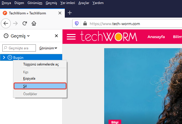 Mozilla içinde aynı şekilde klavyeden CTRL+H tuşuna bastıktan sonra gelen soldaki internet geçmişi panelinde gün ve ayların üzerini tek tek sağ klikleyerek sil diyoruz. Böylece Mozilla internet tarayıcısındaki tüm internet geçmişi silinmiş olacaktır.