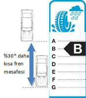 Kullanılan araç, hava veya yol gibi birçok koşula göre fren mesafesi değişiklik gösterebilmektedir. Ama tüm bunların eşit sayıldığı bir ortamda yandaki gibi Islak Zemin Performası’ndan A alan bir lastik ile G puan alan bir başka lastik arasında fren mesafesi açısından %30’luk bir avantaj söz konusu olabilmektedir. %80 hıza sahip normal bir araçta orta derecede uygun bir yol üzerinde durma mesafesi 18 metreye kadar kısalabilir.