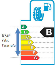 Kullanılan araç, hava, yol ve sürücü gibi birçok koşula göre yakıt tüketimi değişiklik gösterebilmektedir. Ama tüm bunların eşit sayıldığı bir ortamda yandaki gibi Yakıt Verimliliği’nden A notu alan bir lastik ile G notu alan bir başka lastik arasında yakıt tasarrufu açısından %7,5’lik bir fark söz konusu olabilmektedir. Ticari taşıtlarda bu oran daha yüksek olabilir.
