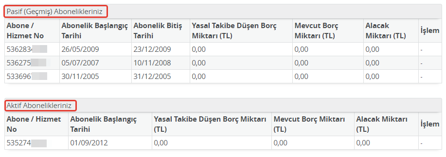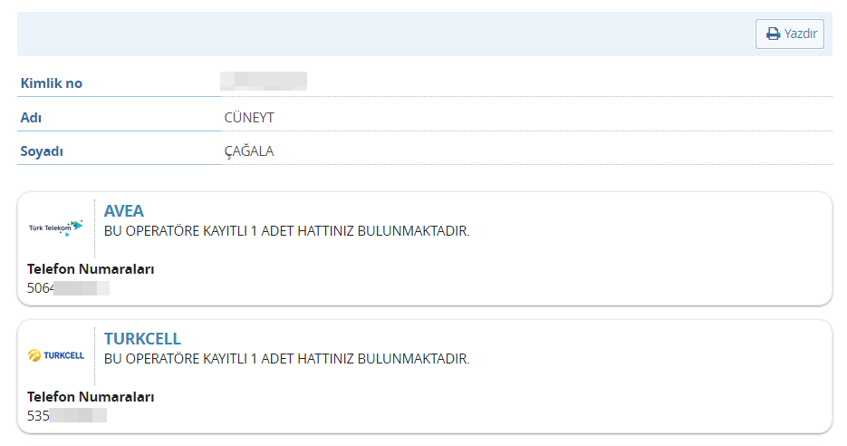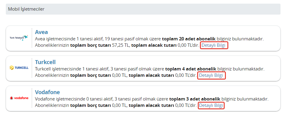 Burada bulunan linki (tıkla) klikleyip e-devlet şifreniz ile giriş yaptıktan sonra geçmişten günümüze kadar sahip olduğunuz telefon numaralarını öğrenebilirsiniz. Giriş yaptıktan sonra Avea (şimdi Turk Telekom), Turkcell ve Vodafone hatlarına ait bilgiler gelecektir. Burada hali hazırda aktif olarak kullanılan ve daha önce kullanıpta şimdi kullanmadığınız yani kapatılmış (pasif) haldeki hat sayısına ait bilgiler gelecektir. Her birinin karşısındaki Detaylı Bilgi sekmesini kullanarak hatların açılmış tarihleri ve telefon numaralarını görebilirsiniz.
