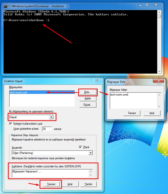 2- Açılan siyah pencereye shutdown -i yazıp entera basın. Yeni bir pencere açılacak. Buraya kapatmak istediğiniz bilgisayarın adını yazın. Kaç saniye sonra kapatılacağını ve uyarı notunu yazıp entera basın. İşlemimiz tamamdır. Ağdaki bilgisayarların adını görmek için net view yazabilirsiniz.