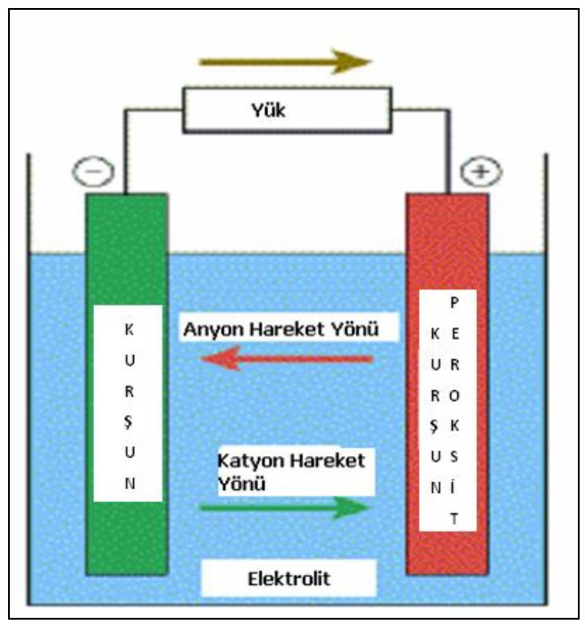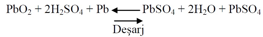 Kimyasal enerjinin elektrik enerjisine dönüştürüldüğü duruma boşalma ( deşarj ) ve tersi olarak elektrik enerjisinin kimyasal enerjiye dönüştürüldüğü duruma ise doldurma (şarj) denir. Bir akünün pozitif ve negatif plakaları, bir dış elektrik devresine bağlandığında, plakaların aktif maddeleriyle akü elektroliti birbiriyle kimyasal bir reaksiyona başlarlar ve devrede elektrik akımı oluşurken akü boşalmaya (deşarj) başlar. Boşalmış olan akü bir doğru akım kaynağına bağlanıp deşarj akımına ters yönde bir şarj akımı geçirilirse her iki kutupta kimyasal bakımdan farklı maddeler yeniden oluşur ve akü tekrar şarj olur. Şarj ve deşarj sırasında meydana gelen olaylar şöyle bir formülle gösterilebilir: