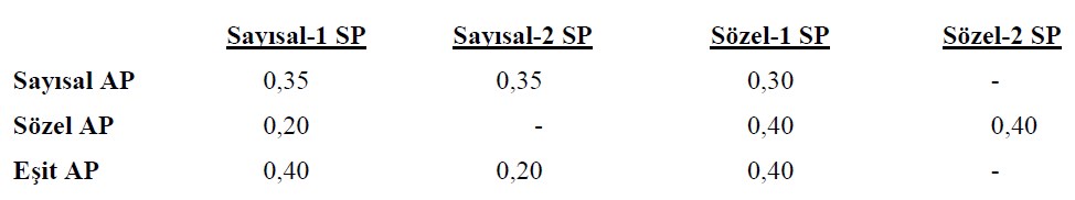 Çoktan seçmeli sorulardan oluşan testlerin uygulandığı bu sınavın cevap kâğıtları ÖSYM’de optik okuyucu ile okunacak ve bilgisayar ortamında değerlendirilecektir. Adayların her testteki sorulara verdikleri doğru ve yanlış cevaplar ayrı ayrı toplanacak, doğru cevap sayısından yanlış cevap sayısının dörtte biri çıkarılarak ham puanlar elde edilecektir. Her test için sınavı geçerli tüm adayların ham puanlarının ortalaması ve standart sapması ayrı ayrı hesaplanarak adayların ham puanları, ortalaması 50, standart sapması 10 olan standart puanlara dönüştürülecektir. Böylece her aday için Sayısal-1, Sayısal-2, Sözel-1, Sözel-2 Standart Puanlar (SP) hesaplanacaktır. Bu standart puanlar kullanılarak her aday için sayısal ağırlıklı, sözel ağırlıklı ve eşit ağırlıklı olmak üzere 3 ağırlıklı puan (AP) hesaplanacaktır. Sınavdan sonra yapılan analizlerde bir testteki sorulardan herhangi biri, biçimsel veya bilimsel bir nedenle ÖSYM tarafından “geçersiz” sayıldığı takdirde, ilgili testte yer alan sorulardan herhangi birini işaretleyen tüm adayların bu soruyu doğru cevapladığı kabul edilecektir. Ağırlıklı puanların hesaplanmasında testlerin ağırlıkları aşağıdaki gibi olacaktır: