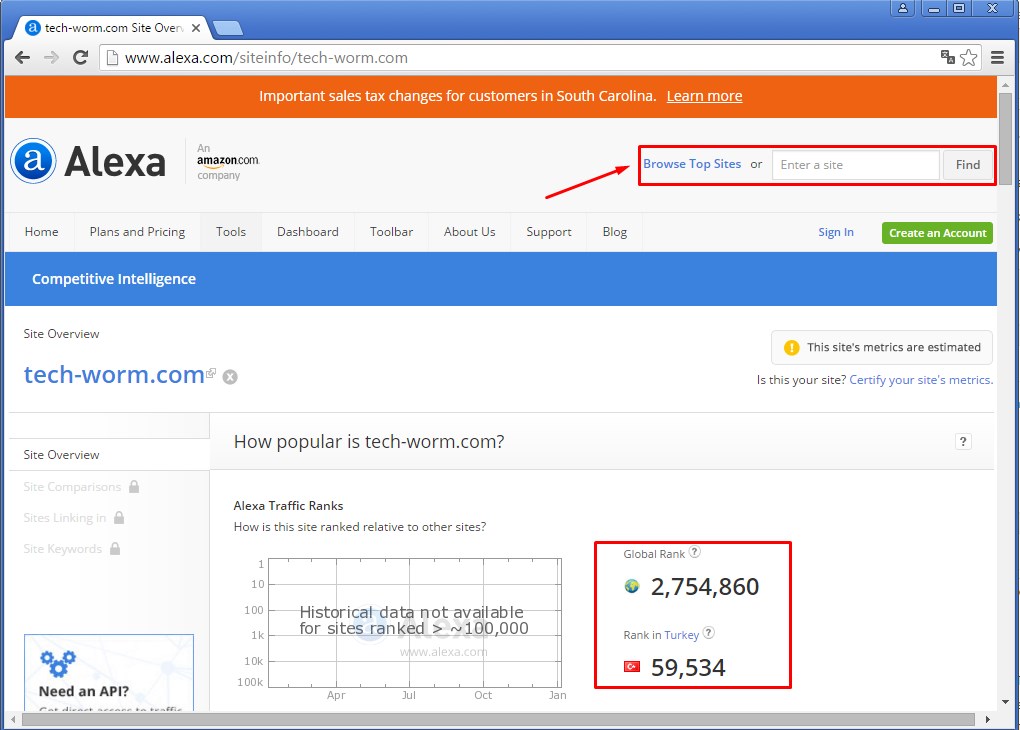 Standart olarak Alexa ile web sitenizin dünyada ve bulunduğunuz ülkedeki sıralaması ile ilgili bilgi sahibi olursunuz. Örneğin şu anda Tech-Worm dünyada bulunan bütün web siteleri arasında 2,754,860 ve Türkiyede ise 59,534 sıradadır.