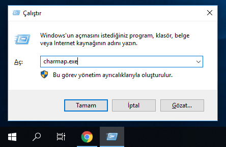 Devamında açılan pencereye charmap.exe yazıp enter tuşuna basın ve karakter eşlem uygulamasına erişin.