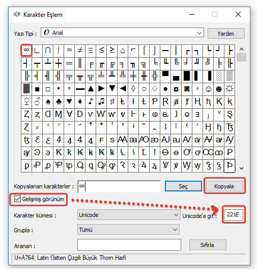 Açılan Karakter Eşlem penceresinde “Gelişmiş Görünümü” seçili hale getirip Unicode’a git yazan yere 221E yazıp enter yapalım. Burada sonsuzluk işaretini klikleyip kopyala diyelim ve dilediğiniz yere yapıştırın.