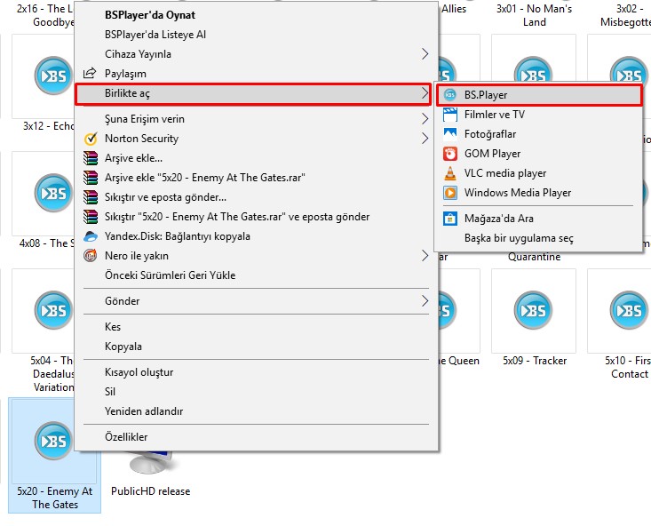 2- Programı indirip kurduktan sonra izleyeceğiniz video/dizi/filmin üzerine gelip sağ klikleyip birlikte aç kısmından BS Player’ı seçip aç diyelim.