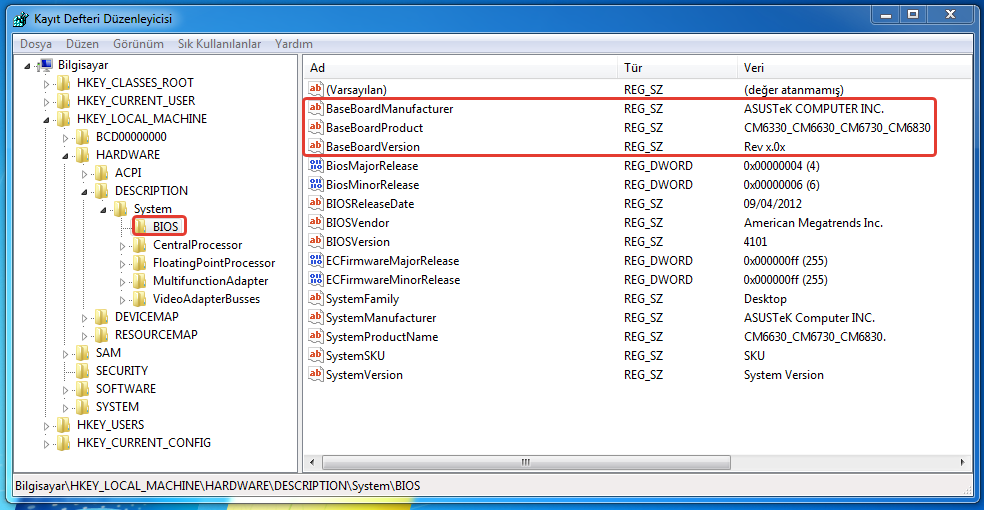 Açılan pencerede sırasıyla HKEY_LOCAL_MACHİNE > Hardware > Description > System > BIOS yolunu takip ettiğinizde en sondaki BIOS kısmında anakartınızla ilgili detaylı bilgilere ulaşabilirsiniz.