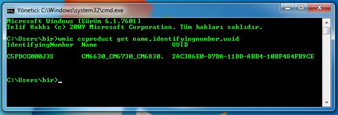 wmic csproduct get name,identifyingnumber,uuid > Bu kod ile anakartınızın modelini ve serial numarasını öğrenebilirsiniz.