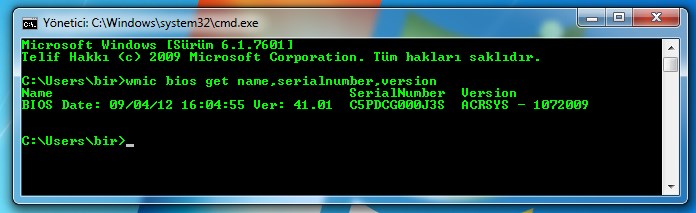 wmic bios get name,serialnumber,version > Bu kod ile BIOS adı ve versiyonu hakkında bilgi edinebilirsiniz.