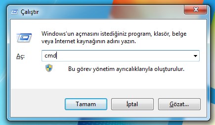 Bu yöntemimizde ise dos komutu kullanarak öğreniyoruz. Aynı şekilde Windows+R tuşuna basın açılan pencereye cmd yazıp enter yapın.