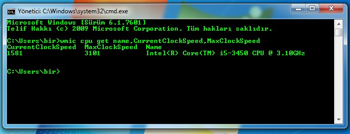 wmic cpu get name,CurrentClockSpeed,MaxClockSpeed > Bu kod ile işlemcinizin modelini öğrenebilirsiniz.