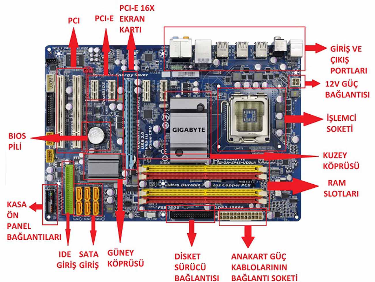 Bilgisayardaki, elektrikle çalışan parçaların üzerinde bulunduğu ana elemandır. Bu parçanın üzerinde PCI, PCI-E, PCI-E16 ekran kartı, giriş çıkış portları, 12v güç bağlantısı, işlemci soketi, kuzey köprüsü, ram slotları, anakart güç kablolarının bağlantı soketi, disket sürücü bağlantısı, güney köprüsü, SATA giriş, IDE giriş, kasa ön panel bağlantıları ve BIOS pili gibi birçok bağlantı noktaları ve giriş çıkış yuvaları bulunmaktadır. Ayrıca ana kart bilgisayarın özelliklerini etkilemektedir. Ana kart ne kadar güçlü olursa ana kartın bulunduğu bilgisayarda o denli güçlü olur.
