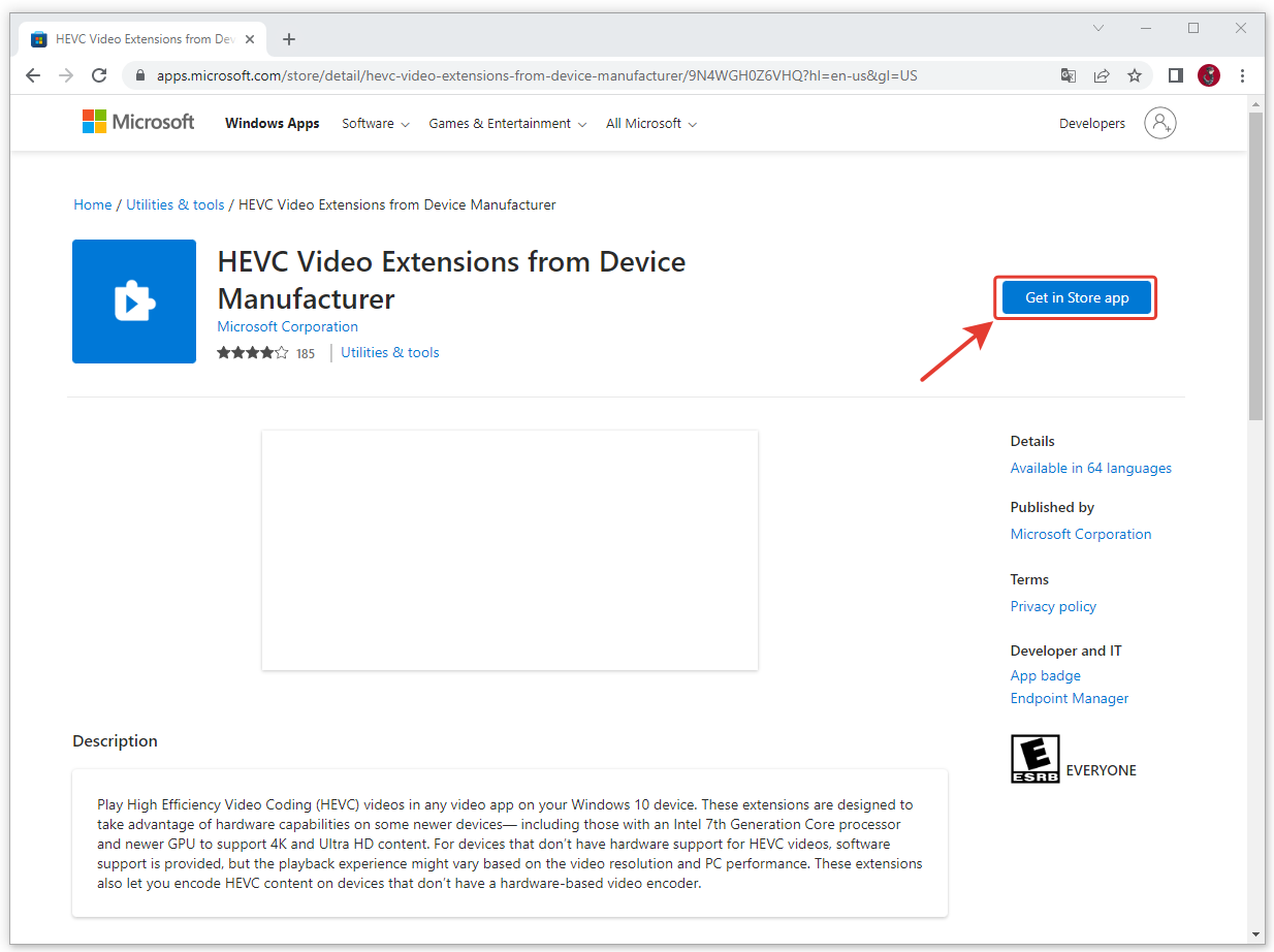 1- Üstte verdiğimiz bağlantıya gittiğinizde karşınıza “HEVC Video Extensions from Device Manufacturer” şeklinde bir uygulama gelecektir. Burada “Get in Store app” diyerek devam ediyoruz. (Uygulamanın ücretsiz olduğunu hatırlatalım.)