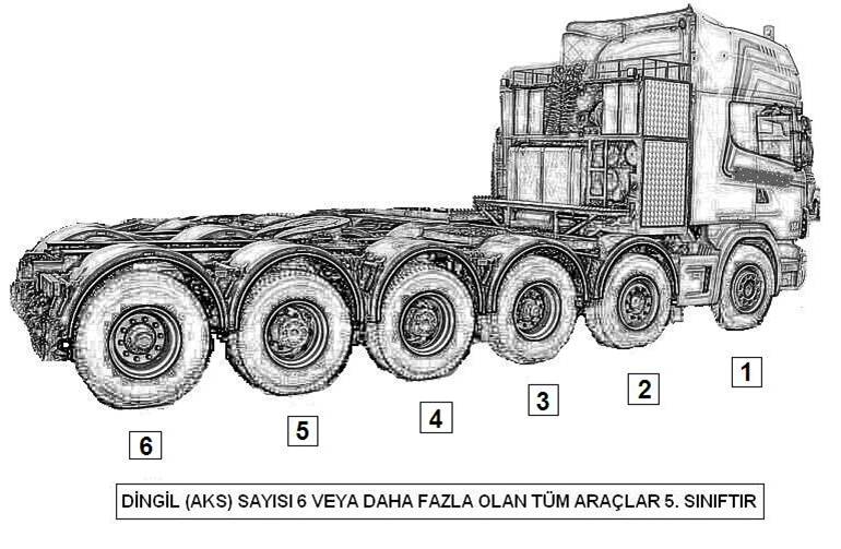 5. Sınıf Araç: AKS adedi (dingil sayısı) 6 ve daha fazla olan kamyon, treyler vb. araç 5.sınıf araçtır.
