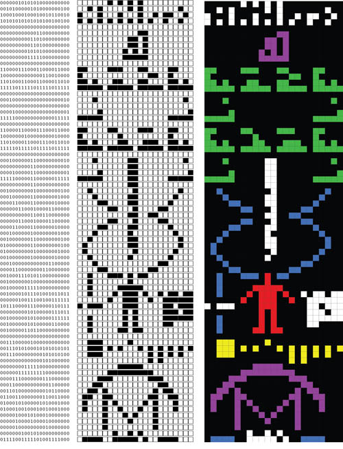 Mesajdaki bit sayısı olan 1679, bir yarı asal (iki asal sayının çarpımı) olduğu için seçilmiştir. Bu sayı, mesaj içeriğindeki her bir bit 23 sütun ve 73 satır olacak şekilde art arda dizildiğinde, içinde çeşitli desenler barındıran bir dikdörtgen oluşturmasını sağlar. 73 sütun ve 23 satır olarak yazılması halinde ortaya anlamsız ve karmaşık bir desen çıkar. Resimdeki bitler grafik karakterlere ya da boşluklara çevirildiğinde sağdaki resimde görülen desen (renk bilgisi taşınmadığı için renksiz olarak) oluşur.