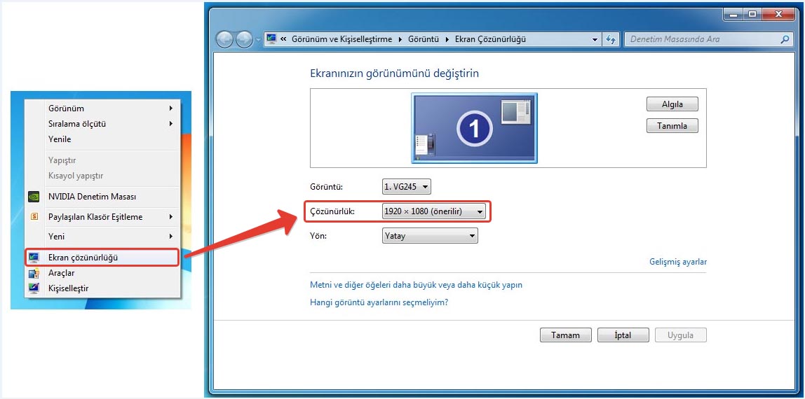 Monitörü bilgisayara bağladıktan sonra sağ altta bulunan POWER simgesinin arka tarafından monitörü açın. Monitör ilk açıldığında çözünürlük değeri farklı gelebilir. Monitör için ideal çözünürlük 1920×1080 piksel. Ancak dilerseniz farklı çözünürlük seçeneklerini deneyebilirsiniz. Masa üstünüzden sağ klik yaptıktan sonra Ekran Çözünürlüğü deyin açılan pencerede 1920×1080 piksel dedikten sonra UYGULA deyin. Eğer denediğiniz farklı çözünürlüklerde ekran simsiyah gelirse klavyeden ESC (Escape) tuşuna basın. Eski çözünürlüğüne geçecektir.