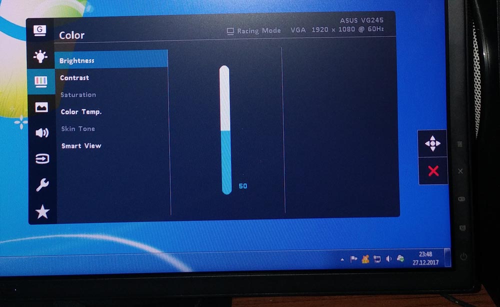 Monitörü bilgisayara ilk kez bağladığınızda ekranın çok parlak olduğunu fark edeceksiniz. Bu nedenle Asus VG245HE Monitörünün ekran ayarlarını yapmanız gerekecektir. Bunun için ekranın ağ altında bulunan çarpı simgesinin arkasındaki tuşa bir kez basmanız yeterli. Böylece aşağıdaki gibi ayar kısmı açılacaktır. Kapatmak için tekrar çarpı simgesine basmanız yeterli. Çarpı simgesinin üst kısmında yön çubuğu bulunuyor. Bu yön çubuğu ile seçenekler arasında gezinebilir veya seçeneklere ait değerleri değiştirebilirsiniz. Ben şahsen şimdilik Brightness (Parlaklık) 50, Contrast (Kontrast) 50 olarak seçtim. Bu benim için şimdilik ön ayar bakımından yeterli bir değer.