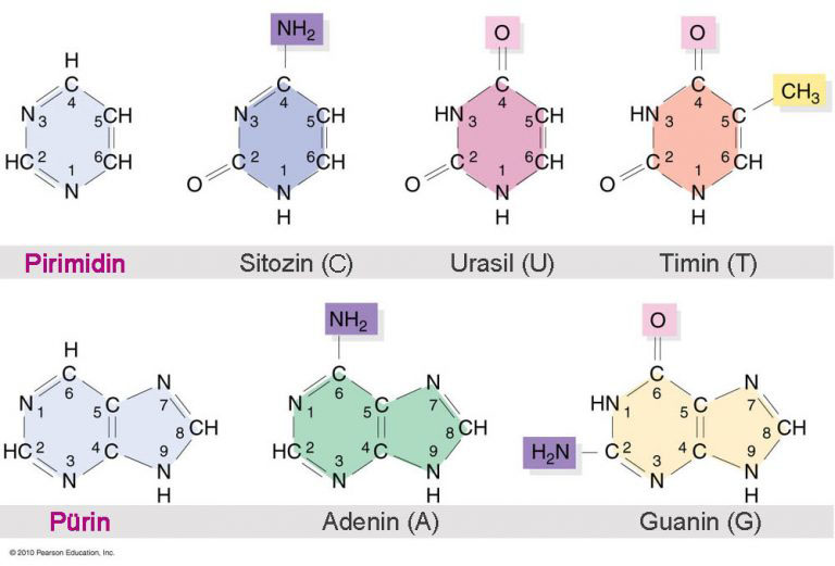 Adenin (A) ve Guanin(G) bazları birer Pürin iken, Timin(T), Urasil (U) ve Sitozin(C) bazları ise birer Pirimidin’dir. Toplamda iki pürin, üç pirimidin bazı vardır.