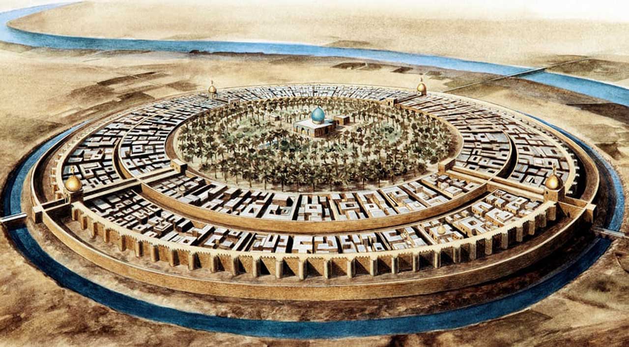 Şehir, merkezinin her taraftan eşit uzaklıkta olacağı tam daire üzerine kurgulanacaktır. Böylece diğer şehirlere göre kontrolünün ve korunmasının daha kolay olacağı düşünülür. El-Mansur’un bu kararına, Geometrinin kurucusu sayılan Öklid’e hayranlığının etkisi de iddia edilir.