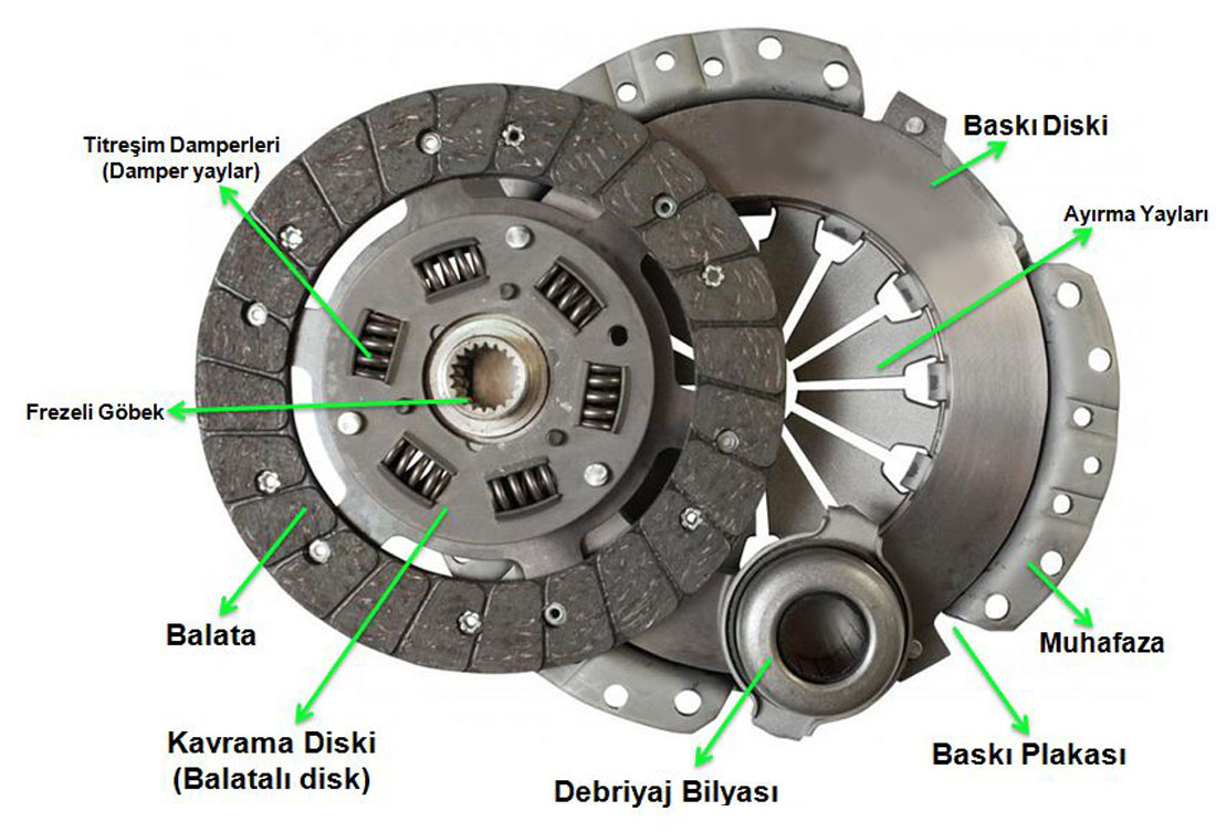 Debriyaj sistemi iki elemandan oluşur; balata (clutch disk) ve baskı plakası (pressure plate). Burada balata, volanın üstünde; baskı plakası da balatanın üstüne yerleşik durumdadır. Debriyaj sistemi denildiğinde aklınıza baskı, balata ve buna bağlı olan bilye (rulman) gelsin. Debriyaj sistemi volan’ın üzerinde montajı yapılır.
