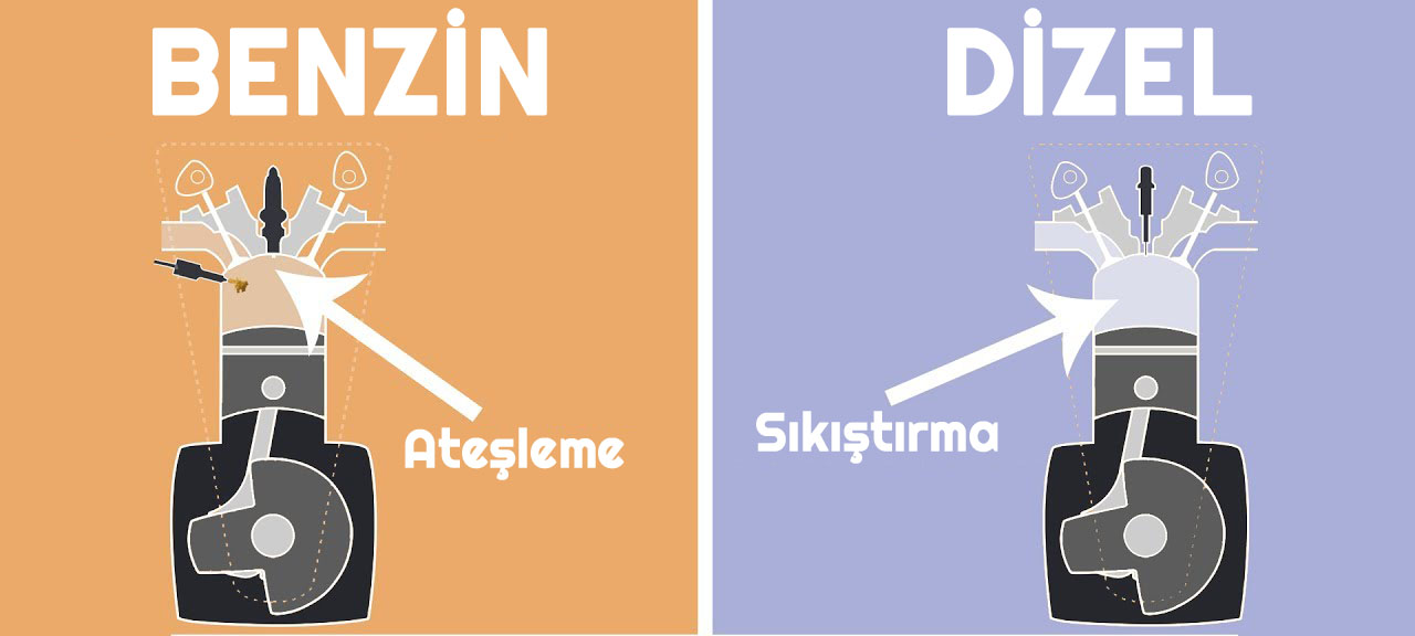 Dizel motorlar; benzinli motorlardan farklı olarak ateşleme için bujiye ve yakıt oksijen karışımını oluşturmak için karbüratöre ihtiyaç yoktur. Yakıt otomatik ateşlemede gerekli olan yüksek sıcaklıkları üretmek için yüksek sıkıştırma oranlarına ihtiyaç duyar (setan sayısı ne kadar yüksek olursa ateşleme o kadar iyi olur).