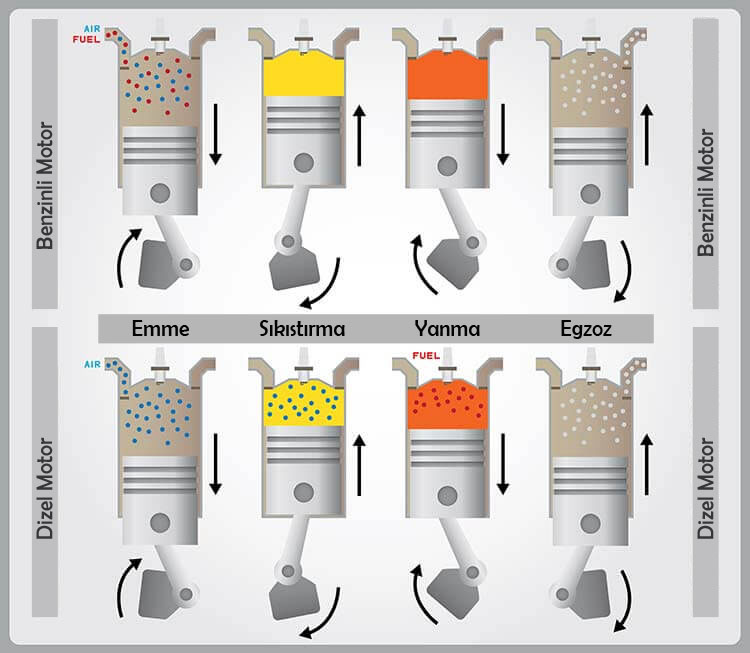 - Yanma Zamanı: Yakıt enjekte edilir (doğru zaman), yaratılan ateşleme etkisiyle , piston aşağı iner.