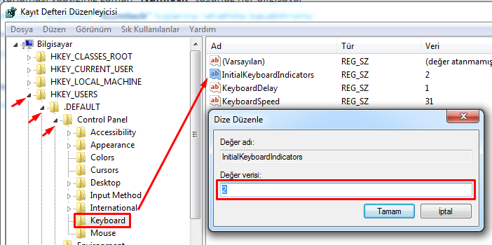- [HKEY_USERS\S-1-5-20\Control Panel\Keyboard] >>>> “InitialKeyboardIndicators”=”2” yapın.