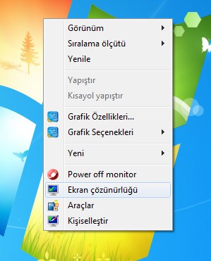 2-Çözünürlüğü Değiştimek: Çözünürlüğü değiştirerek uygun ekranı seçebilirsiniz. Masaüstünden farenizle SAĞ KLİK yapın. Açılan pencerede ÇÖZÜNÜRLÜK kısmından uygun olanı seçerek test edin. Önce UYGULA deyin kontrol edin. Uygunsa tamam deyim çıkabilirsiniz. Değilse ESC ile çıkıp tekrar uygun bir çözünürlük seçin.