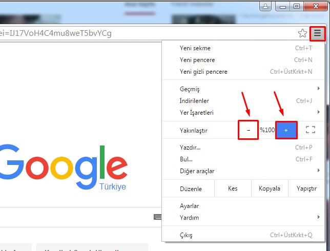 Chrome kullanıyorsanız dilerseniz sağ üst trafta bulunan üç çizgiyi klikleyerek açılan panelde yakınlaştır kısmındaki – veya + kısmını seçebilirsiniz.