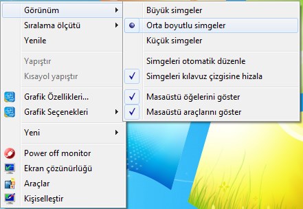 1- Masaüstündeki İkon/Simge Büyütme veya Küçültme: Bilgisayarınızın masaüstünde ki İKONLARIN/SİMGELERİN büyütme veya küçültme olayı. Masaüstünde farenizi SAĞ KLİK yapın alttaki gibi bir seçenek açılacak. GÖRÜNÜM kısmından BÜYÜK SİMGELER, ORTA BOYLU SİMGELER veya KÜÇÜK SİMGELER kısmından bir tanesini seçin.