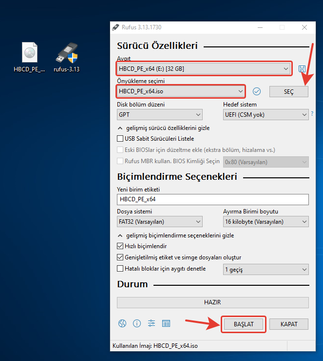 Bu sitelerden bir tanesinde Hiren’s BOOTCD programını indiriyoruz, diğerinden ise RUFUS adlı programı indiriyoruz. Rufus adlı program Hiren’s BOOTCD adlı programı USB belleğe yazdıracak olan program oluyor. Hiren’s BOOTCD programı ise şifre sıfırlamak için kullandığımız çok amaçlı, yasal ve ücretsiz bir yazılım oluyor. Bu iki programı indirdikten sonra RUFUS adlı programı çalıştırıyoruz ve gelen pencerede Aygıt kısmında USB belleğimizi seçiyoruz, burada doğru USB Belleği seçtiğinize emin olun, çünkü bu işlemlerden sonra USB bellek içindeki veriler silinecektir. SEÇ kısmından ise ISO kalıbı şeklinde indirmiş olduğumuz Hiren’s BOOTCD programını gösteriyoruz. İşlemimiz tamam, şimdi başlat diyoruz ve pencerede “HAZIR” uyarısı görene kadar bekliyoruz.