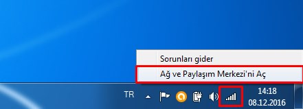 1- Bilgisayarın sağ alt kısmında bulunan bağlantı kısmını sağ klikleyin! Açılan pencereden “Ağ ev Paylaşım Merkezini Aç” seçeneğini seçin.