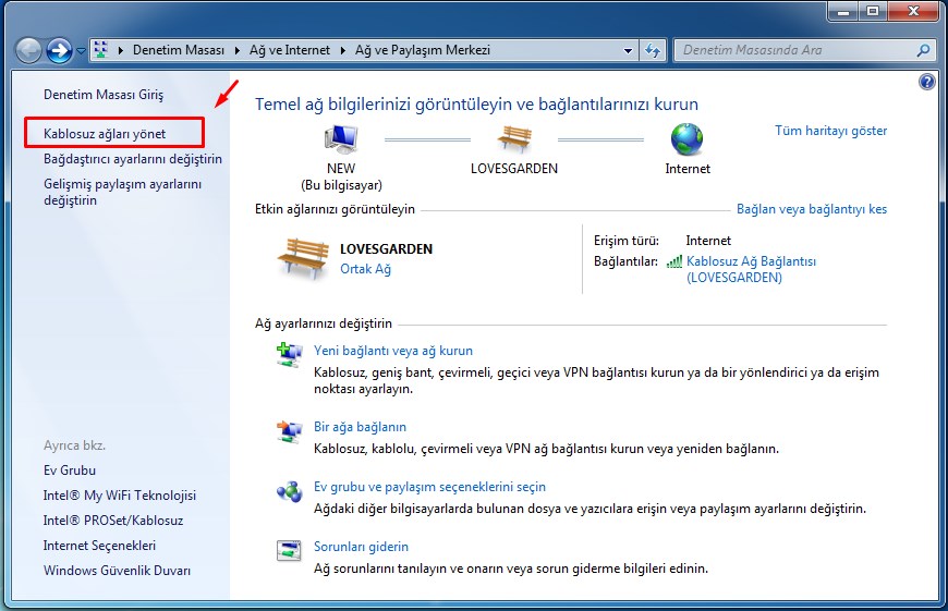 2- Açılan pencereden sol üstte bulunan “Kablosuz Ağları Yönet” seçeneğini seçin.