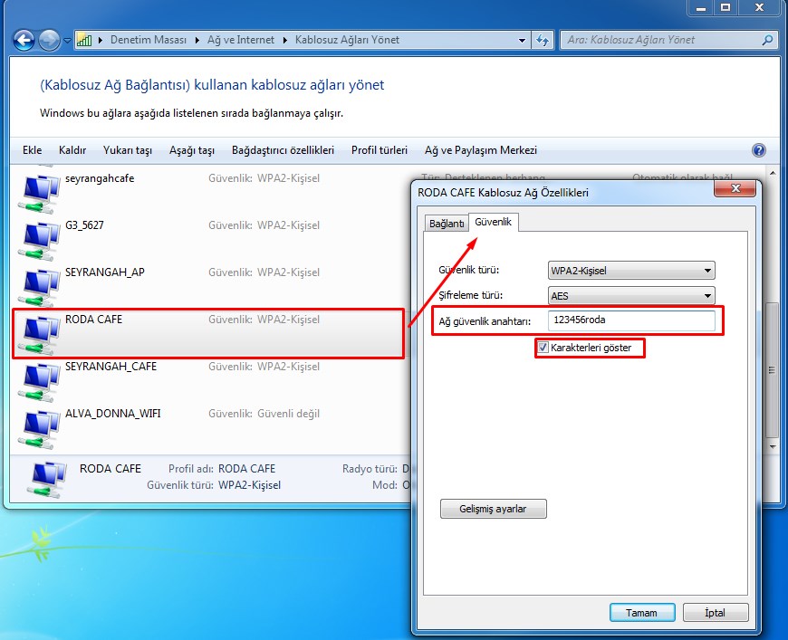 3- Son olarak hangi bağlantıya ait şifreyi öğrenmek istiyorsanız o wifi adına klikleyin ve açılan küçük panelden Güvenlik sekmesine klikleyip karakteri göster deyin. Wifi şifresi görünecektir.