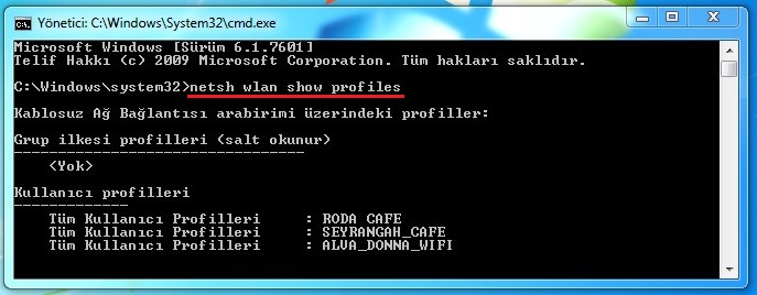 2- Ardından açılan siyah ekrana netsh wlan show profiles yazıp entera basın. Bunu yaptığınızda daha önce bağlanmış olduğunuz kablosuz ağların bilgisi gelecektir.