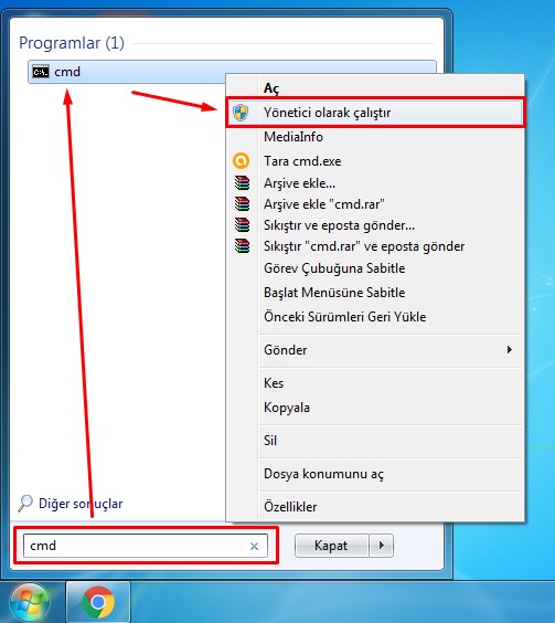 1- Bilgisayarın başlat kısmına cmd yazarak açılan göstergede üzerini sağ klikleyerek Yönetici Olarak Çalıştır seçeneğini seçin.
